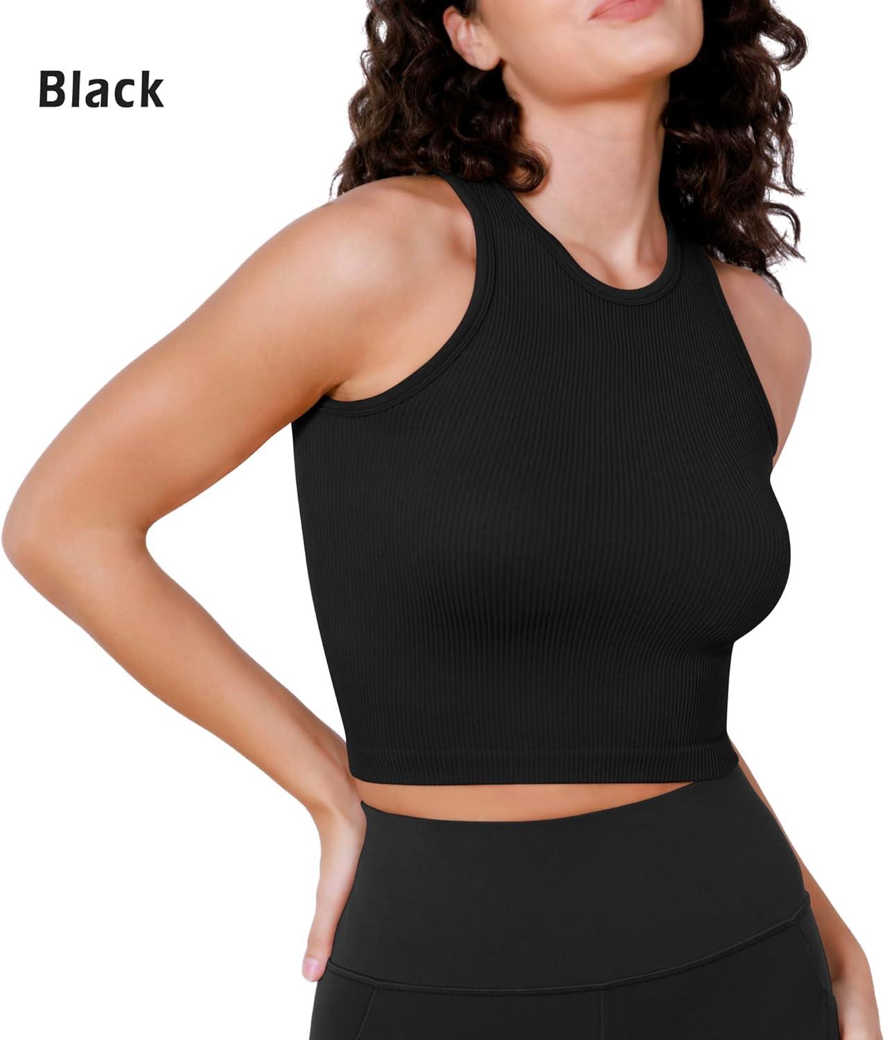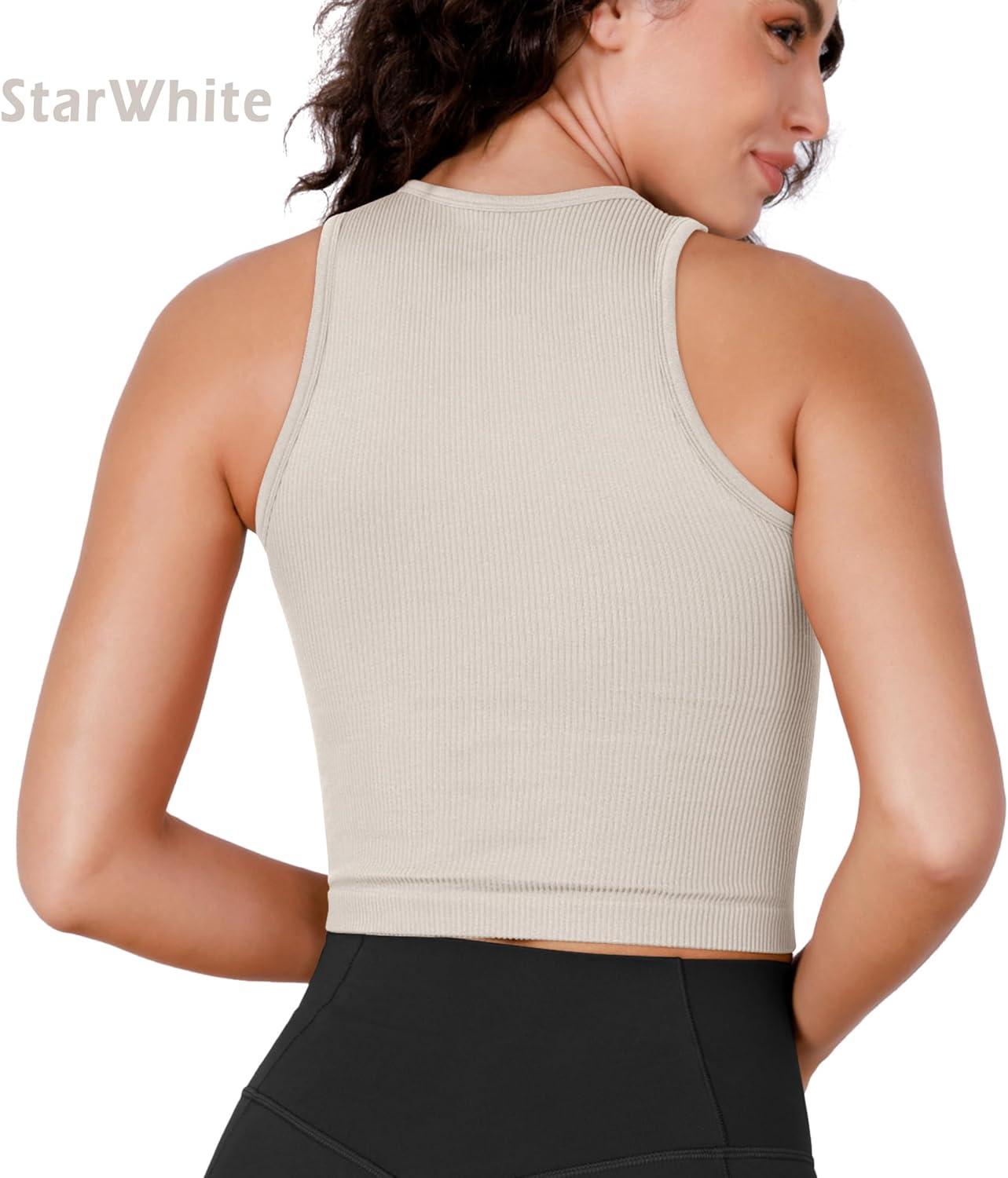 ODODOS 3-Pack Seamless Crop Tank for Women Ribbed Soft High Neck Cropped Tops(Black+beige+star White)