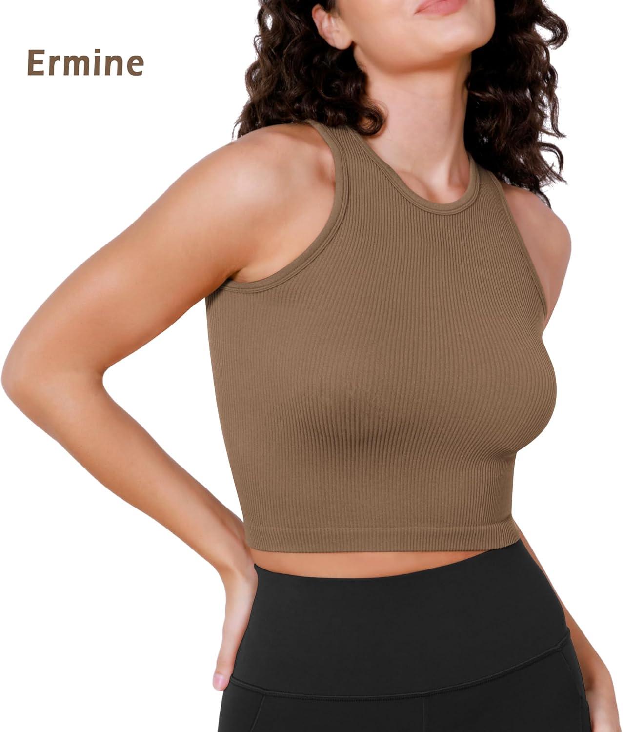 ODODOS 3-Pack Seamless Crop Tank for Women Ribbed Soft High Neck Cropped Tops(Ermine+ivory+star White)