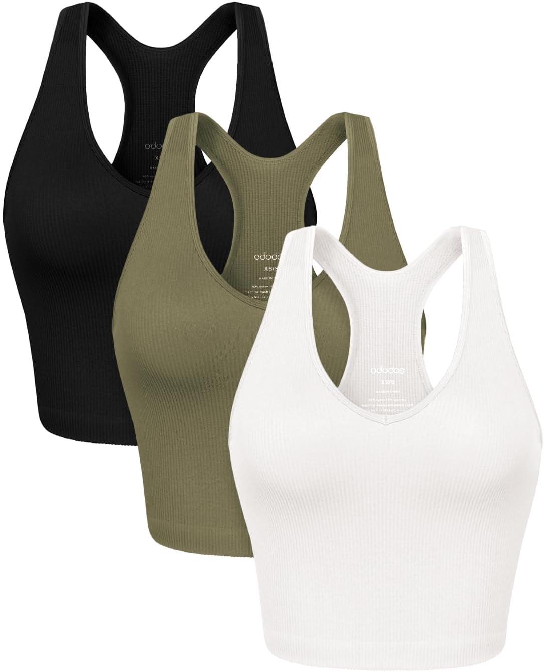 ODODOS 3-Pack Seamless Racerback Crop Tank for Women Ribbed Knit Soft Crop Tops(Black+nutria+white)