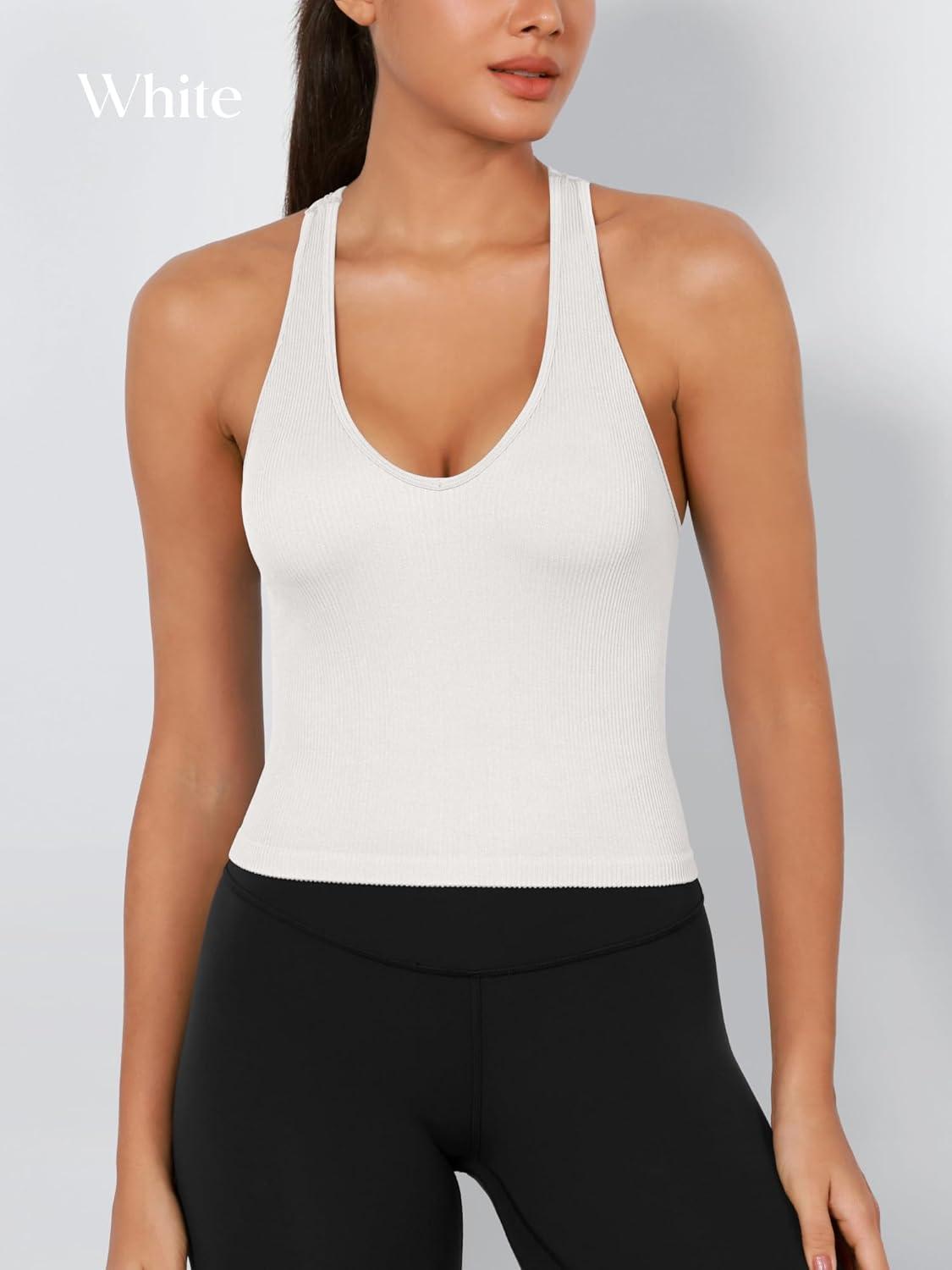 ODODOS 3-Pack Seamless Racerback Crop Tank for Women Ribbed Knit Soft Crop Tops(Ermine+ivory+navy)