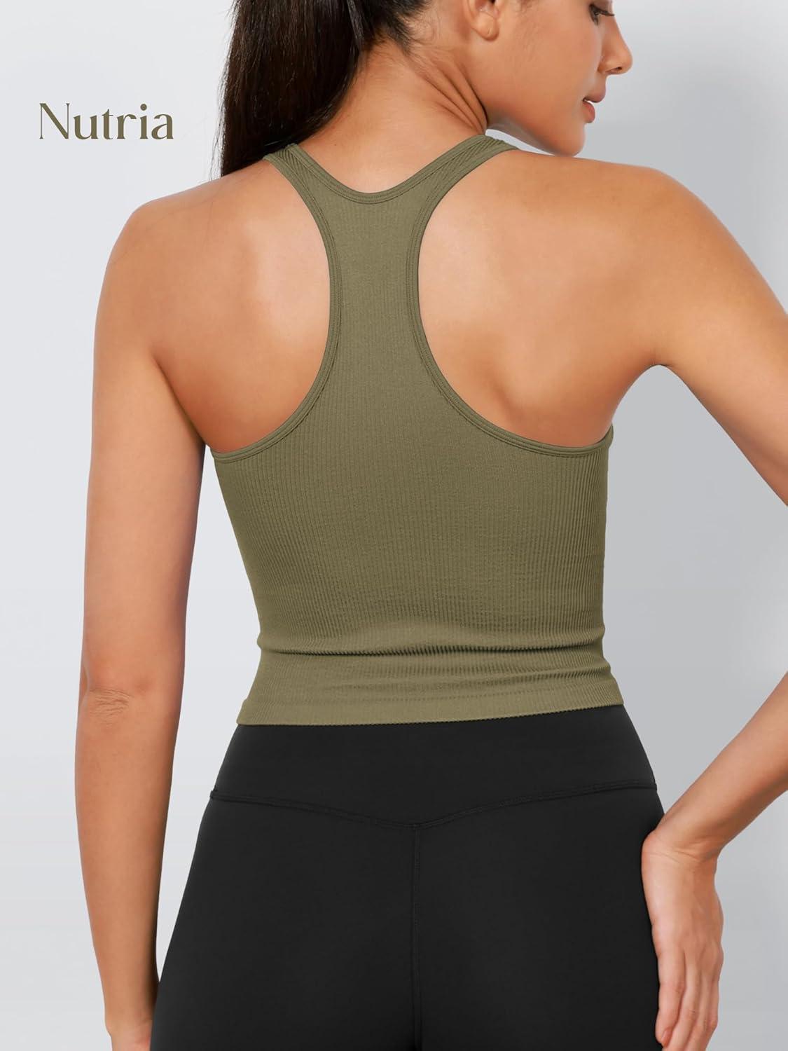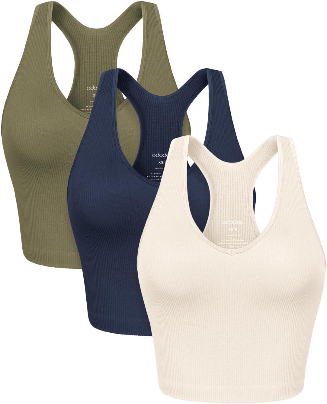ODODOS 3-Pack Seamless Racerback Crop Tank for Women Ribbed Knit Soft Crop Tops(Ivory+navy+nutria)