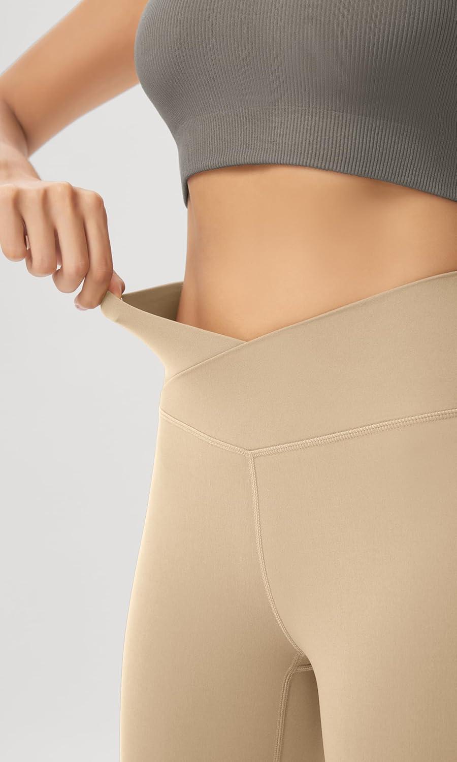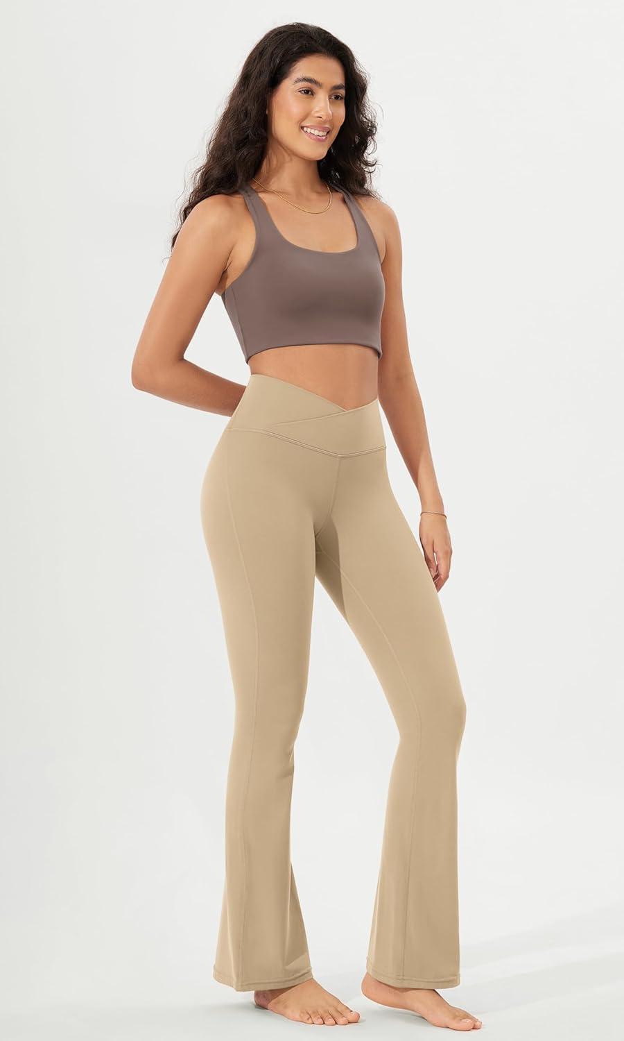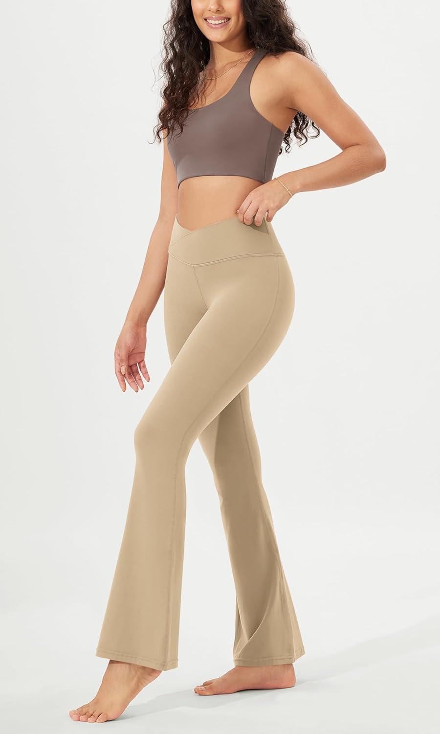 ODODOS Women’s Crossover Flared Yoga Pants Cloud Feeling Soft High Waist Bootcut Leggings with Back Pocket -30″ / 32″ Inseam(Beige)