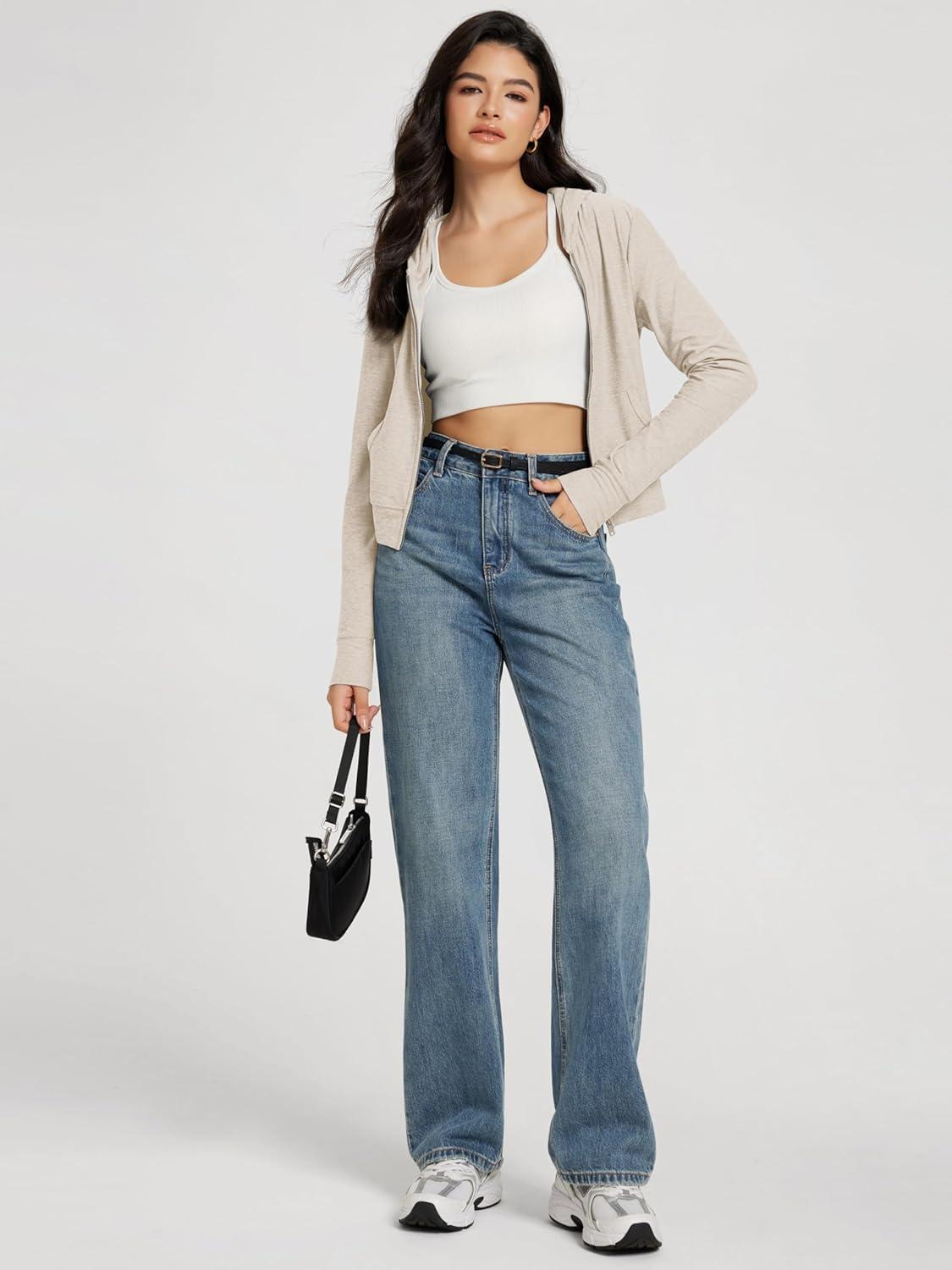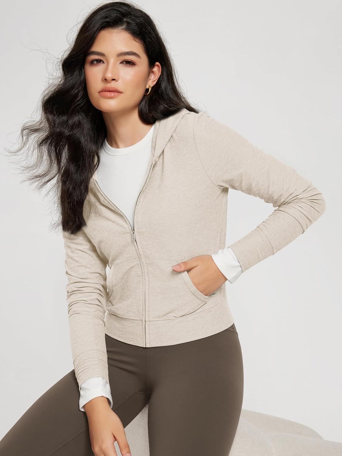 ODODOS Women’s Full-Zip Cropped Hoodie – Stratum Tech Ultra Soft UPF 50+ Hooded Jacket with Pockets(Ecru Heather)