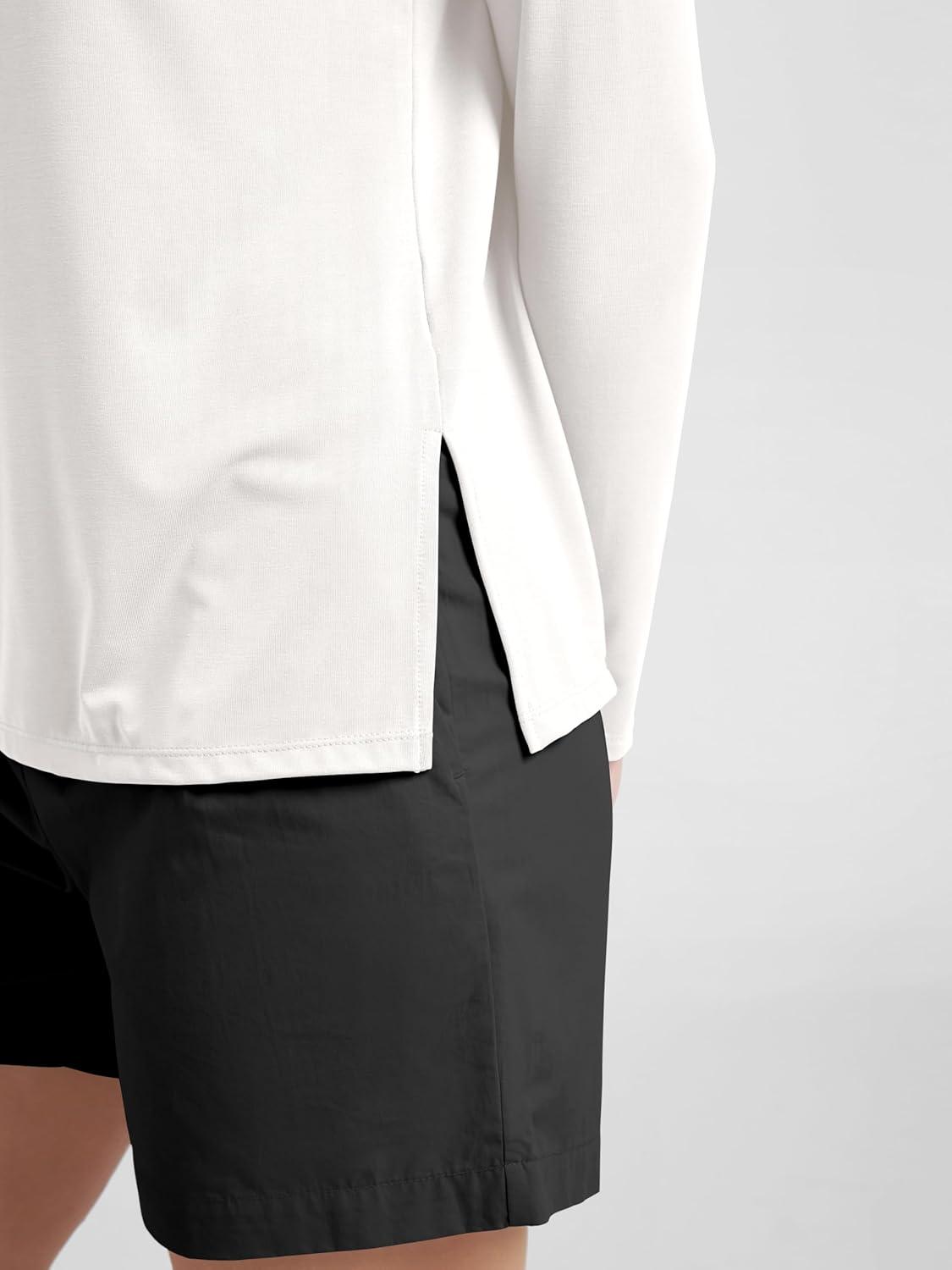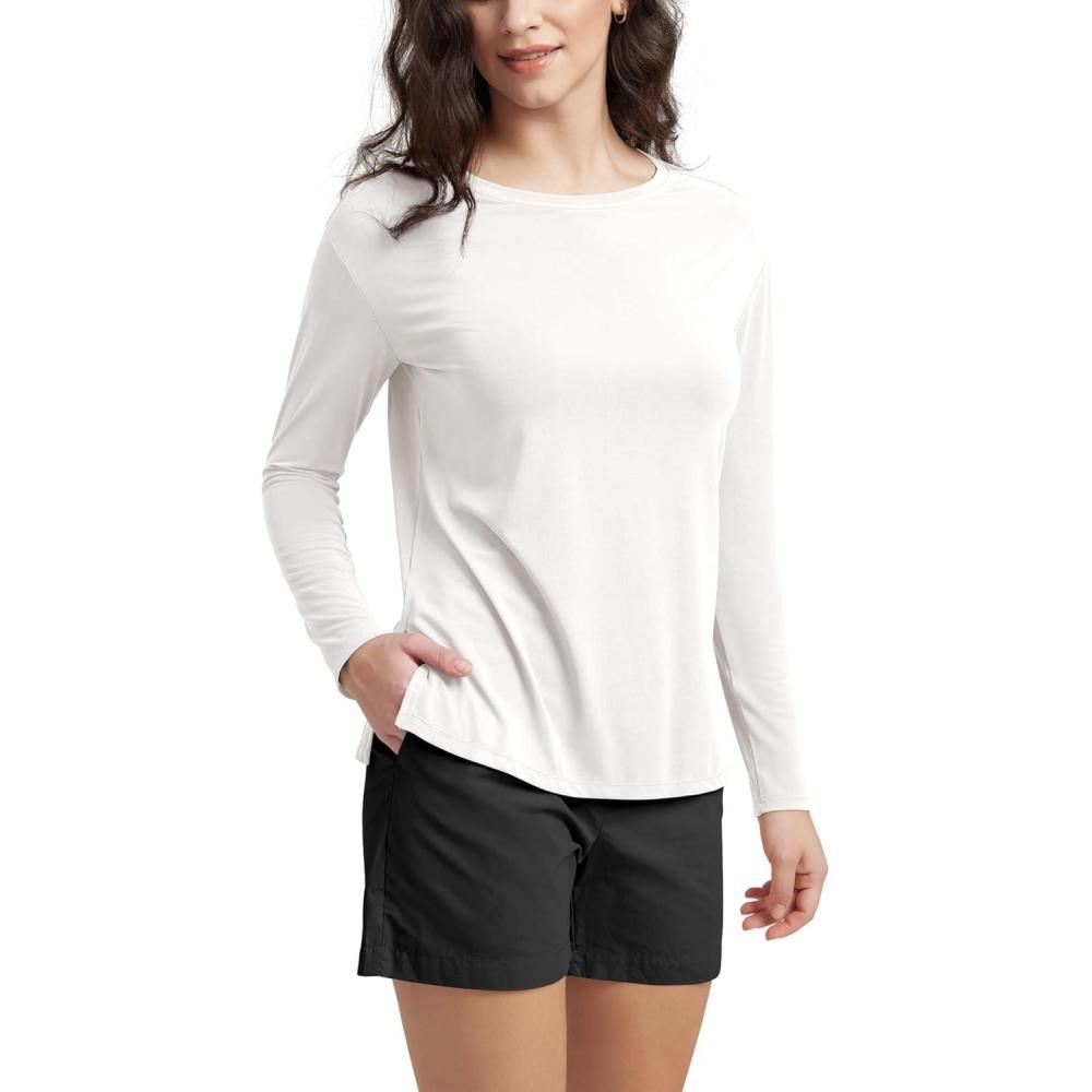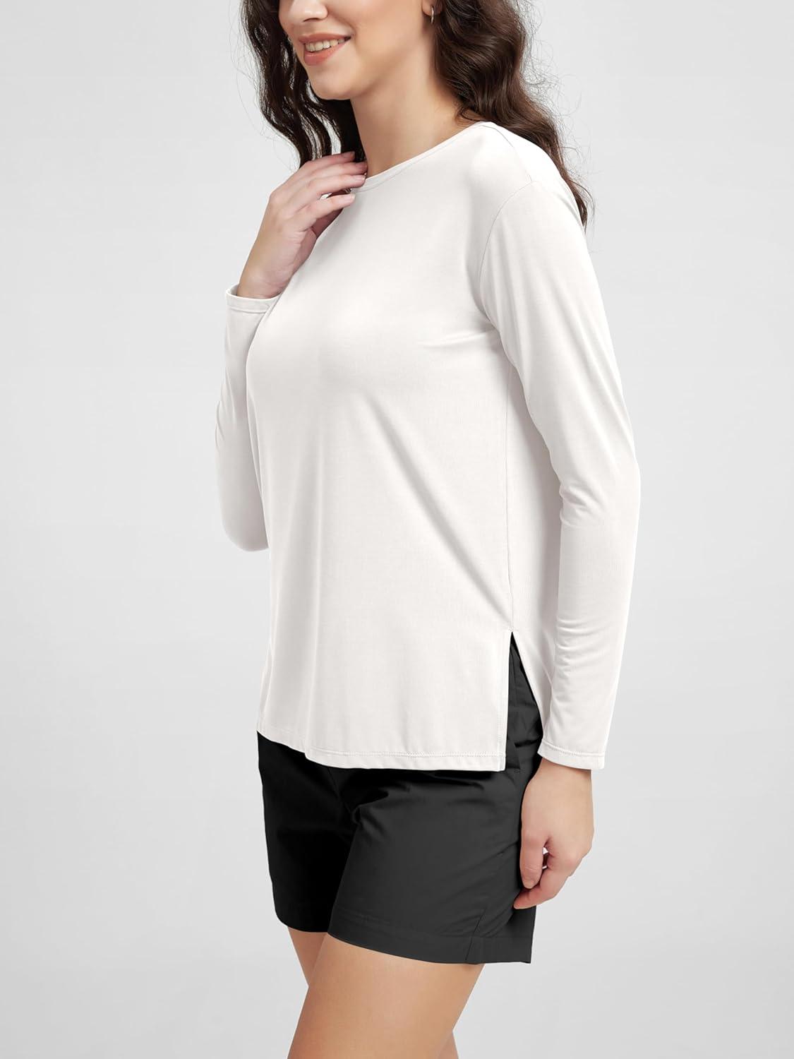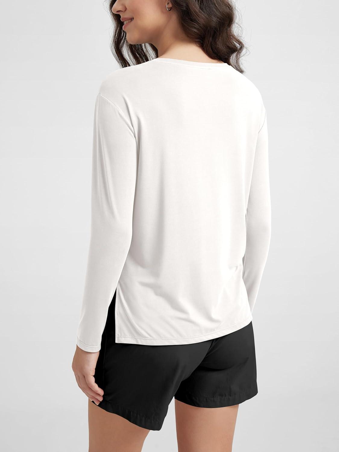 ODODOS Women’s Relaxed Fit Long Sleeve Shirts Boat Neck Side Slit Peach-Soft Casual Lounge Yoga Tops(Milk White)