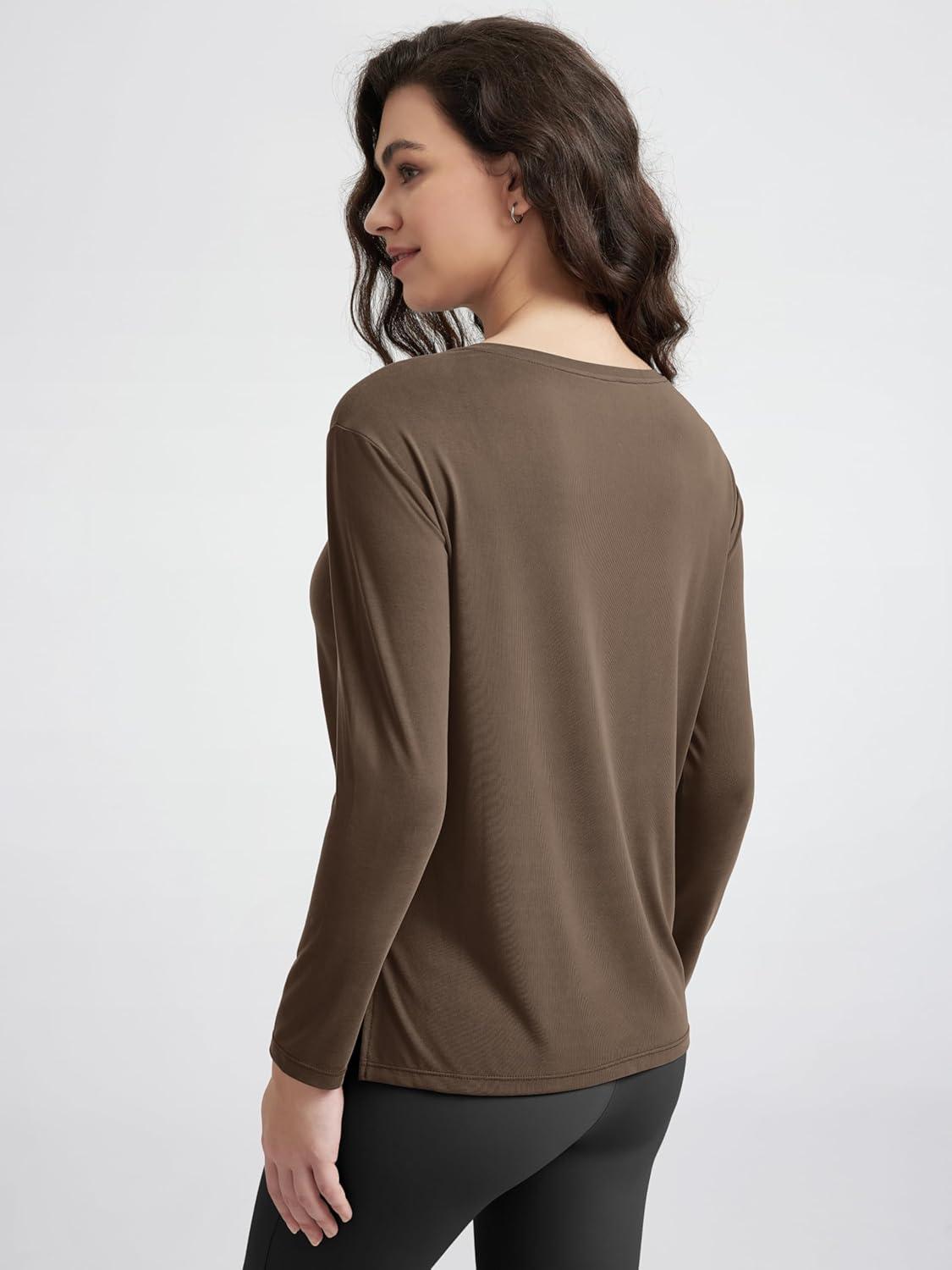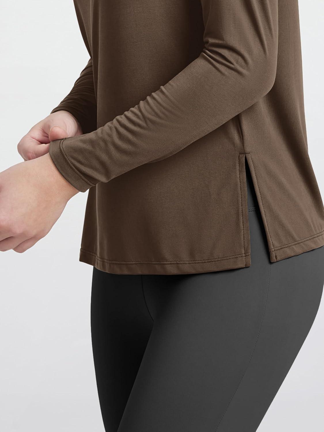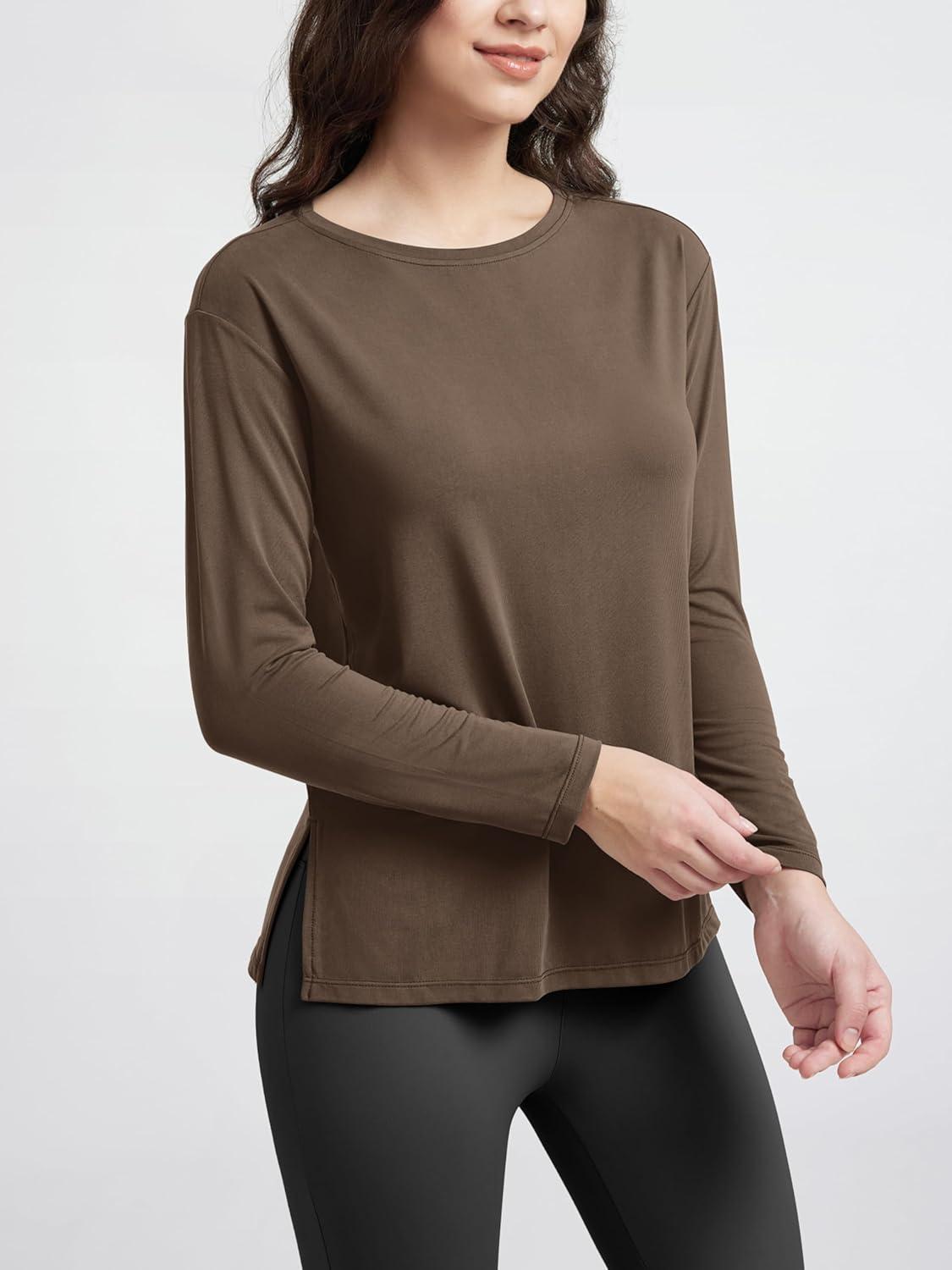 ODODOS Women’s Relaxed Fit Long Sleeve Shirts Boat Neck Side Slit Peach-Soft Casual Lounge Yoga Tops(Nutria)