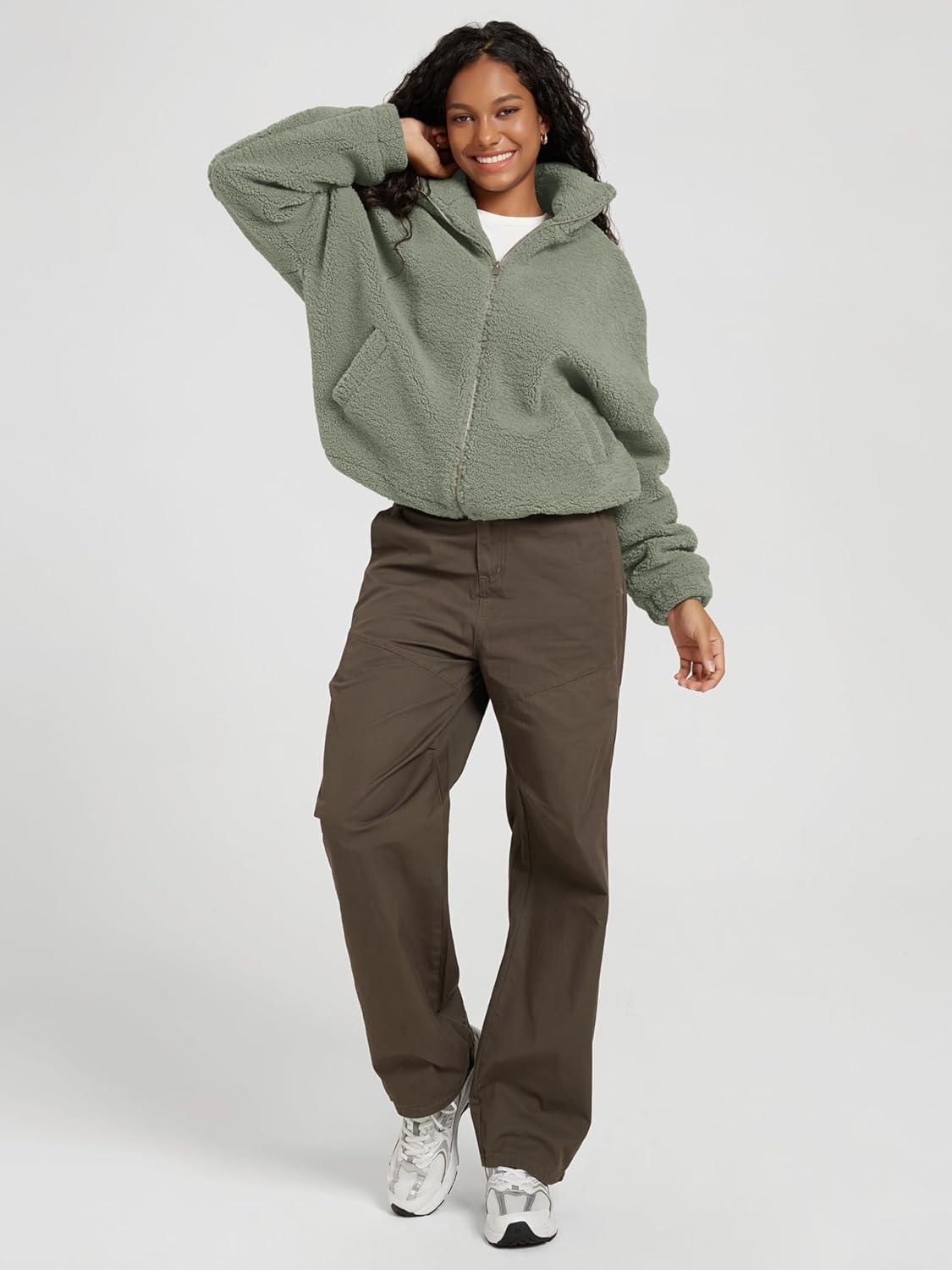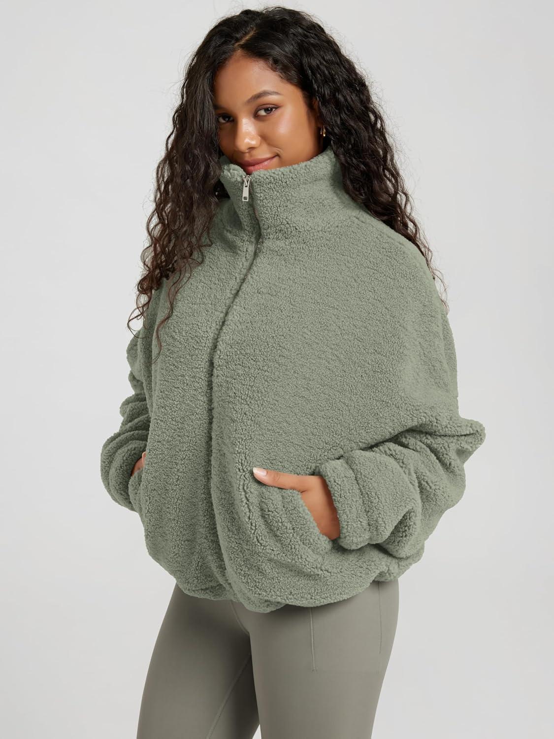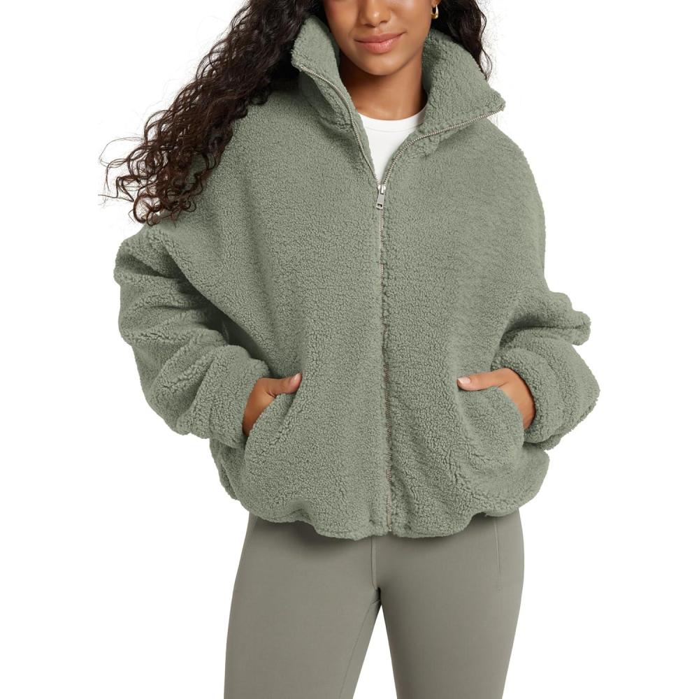 ODODOS Women’s Sherpa Fleece Full-Zip Jacket Long Sleeve Coat Soft Warm Cinchable Outerwear with Pockets(Celadon Green)