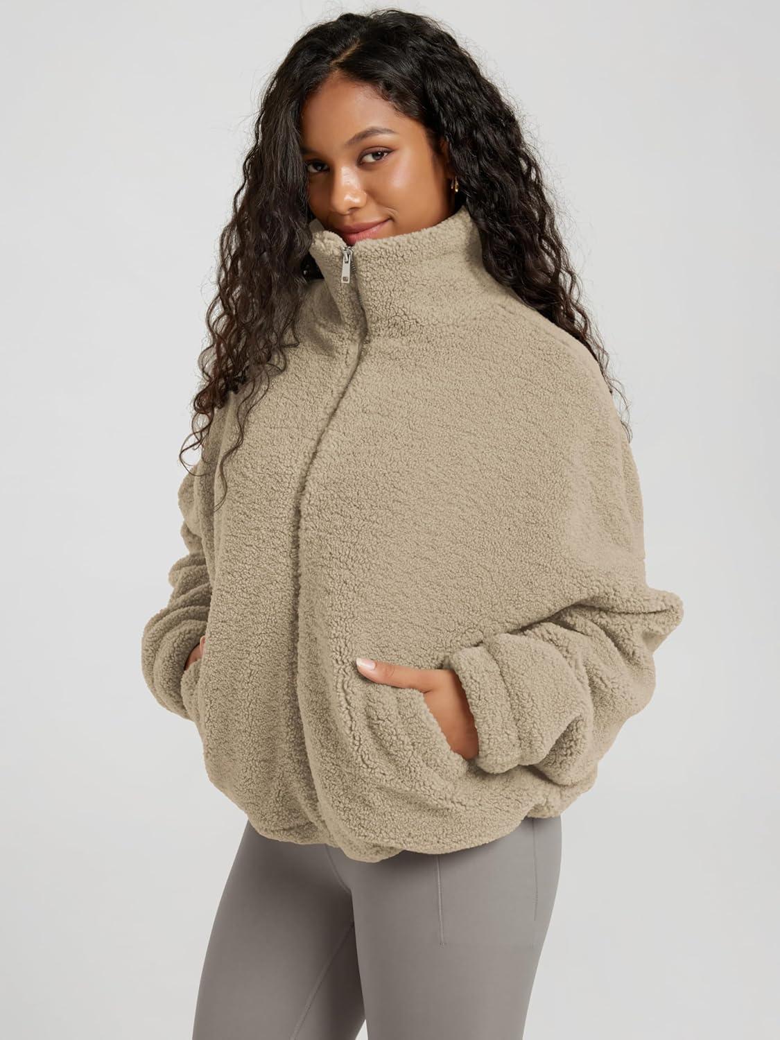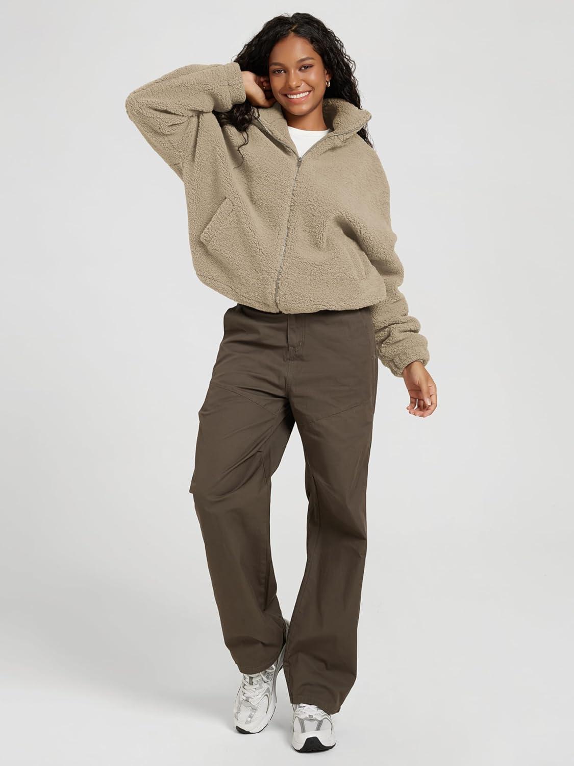ODODOS Women’s Sherpa Fleece Full-Zip Jacket Long Sleeve Coat Soft Warm Cinchable Outerwear with Pockets(Khaki)