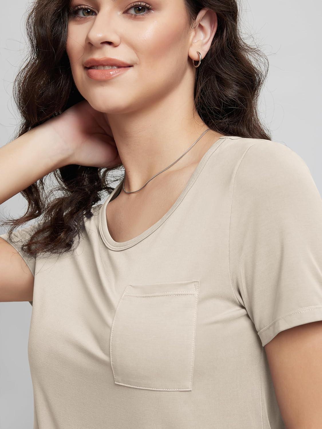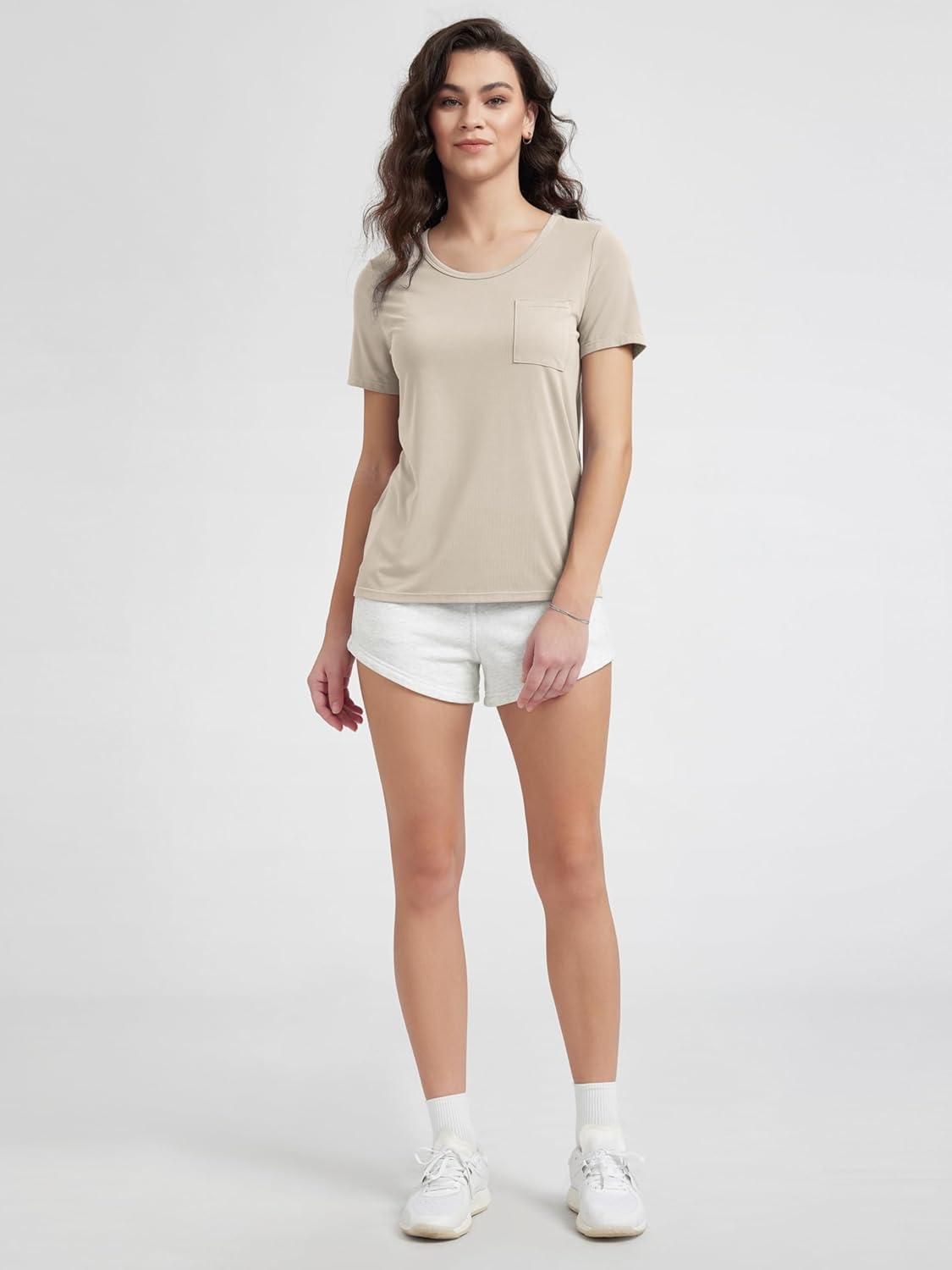 ODODOS Women’s Short Sleeve T-Shirts with Pocket – Ultra Soft Relaxed Tee Casual Lounge Yoga Tops(Beige)