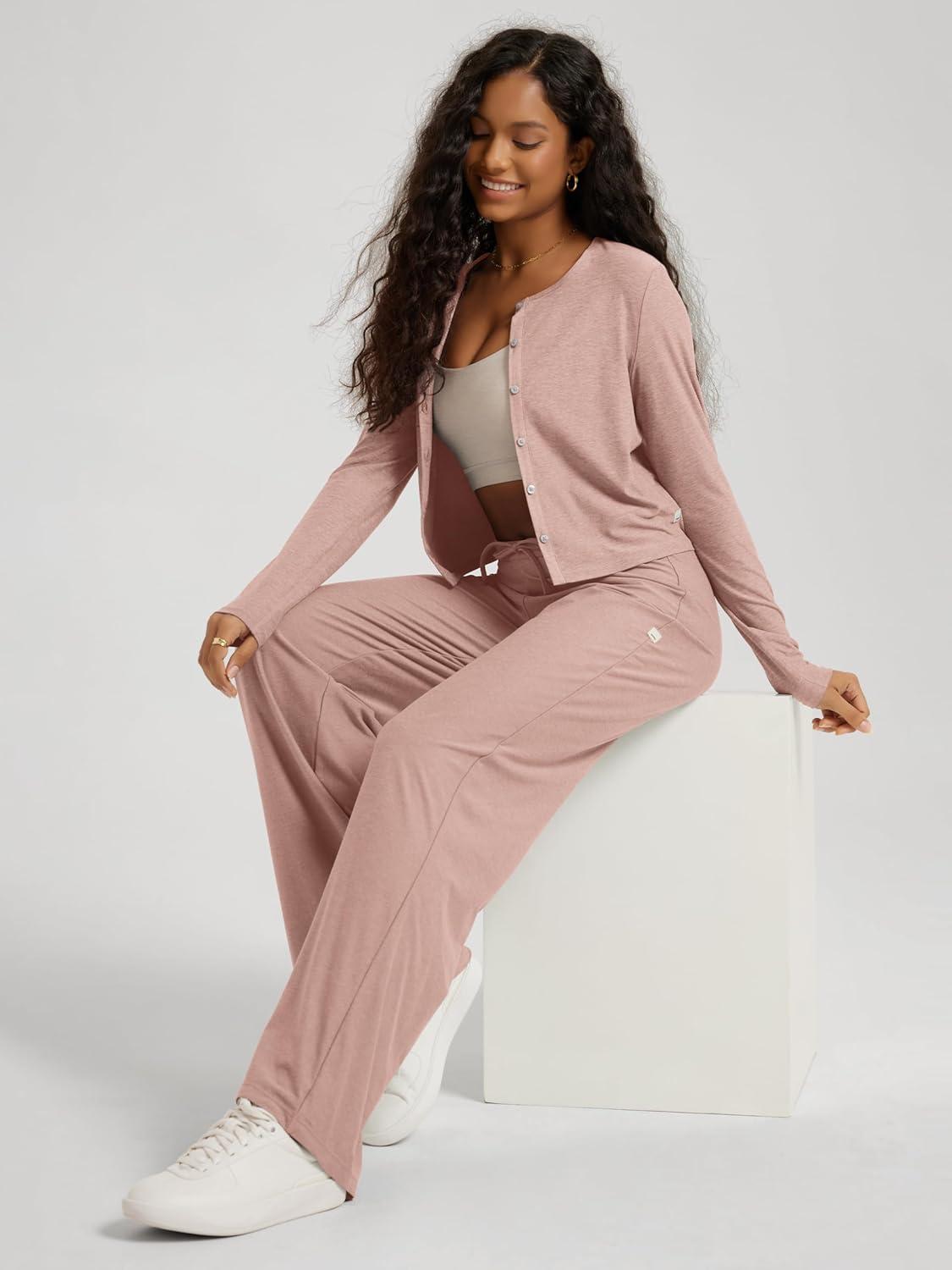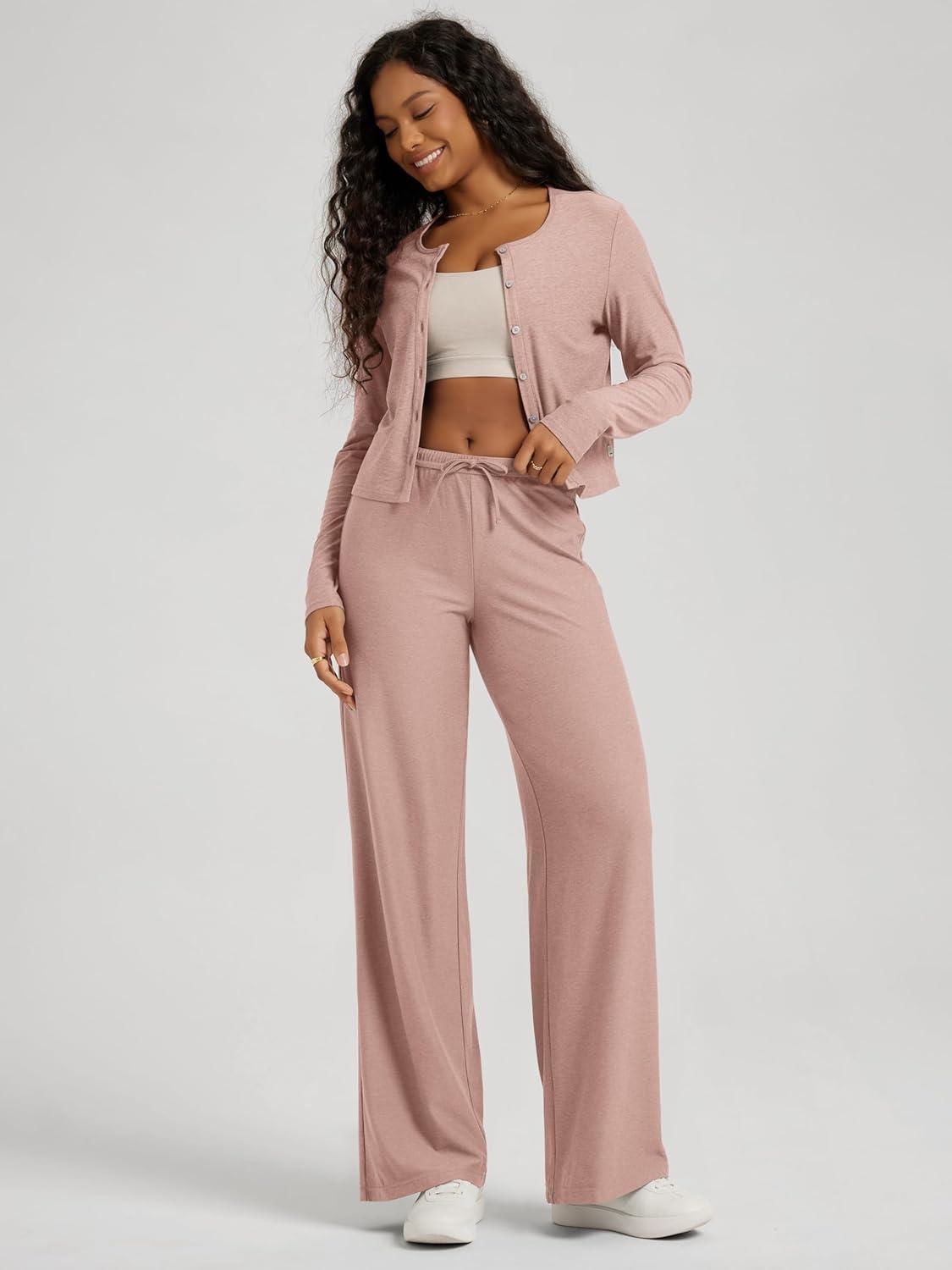 ODODOS Women’s Wide Leg Pants – Ultra Soft Stratum Tech Adjustable Mid-Rise Casual Pajama Lounge Pants(Rose Pink Heather)